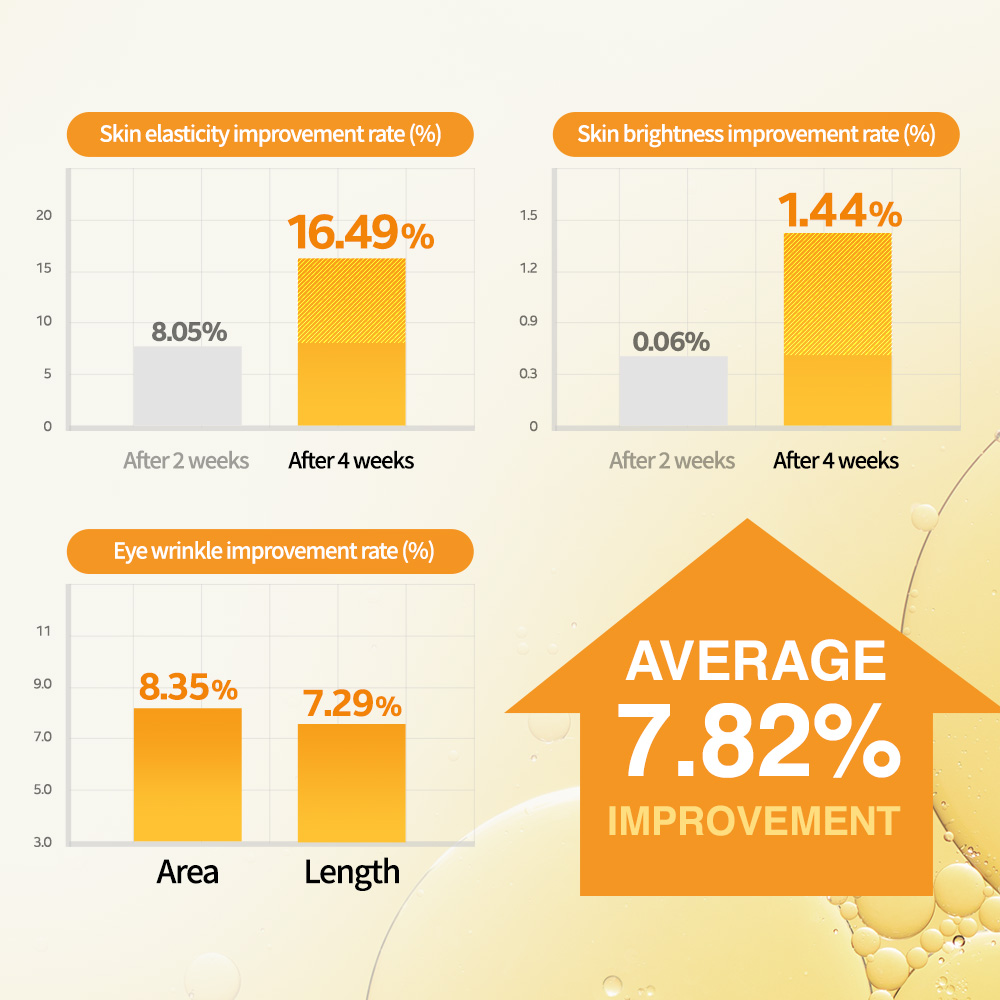 Elasticity improved by +16.49%, fine lines around the eyes reduced by -7.82%, and noticeable brightness improvement! See the visible changes and feel them for yourself.