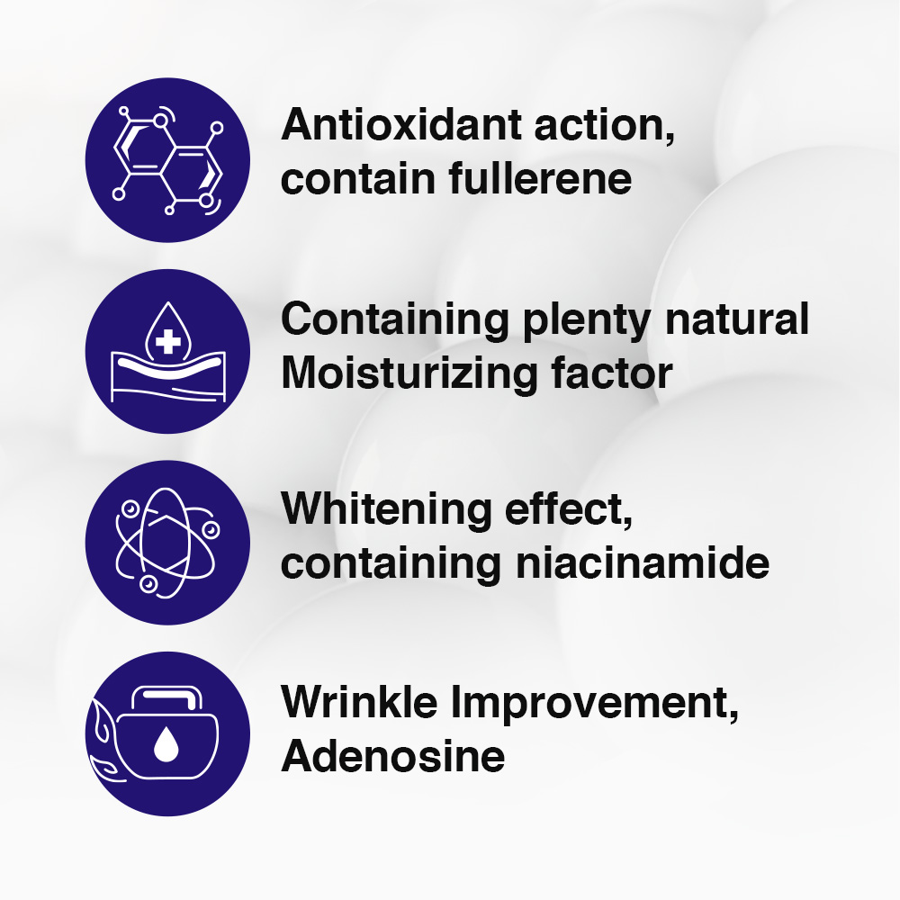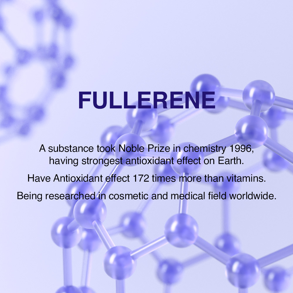 Fullerene, a Nobel Prize-winning ingredient, boasts 172 times stronger antioxidant effects than Vitamin C. It provides rich hydration and radiance to the skin, promoting smooth and glowing skin texture.
