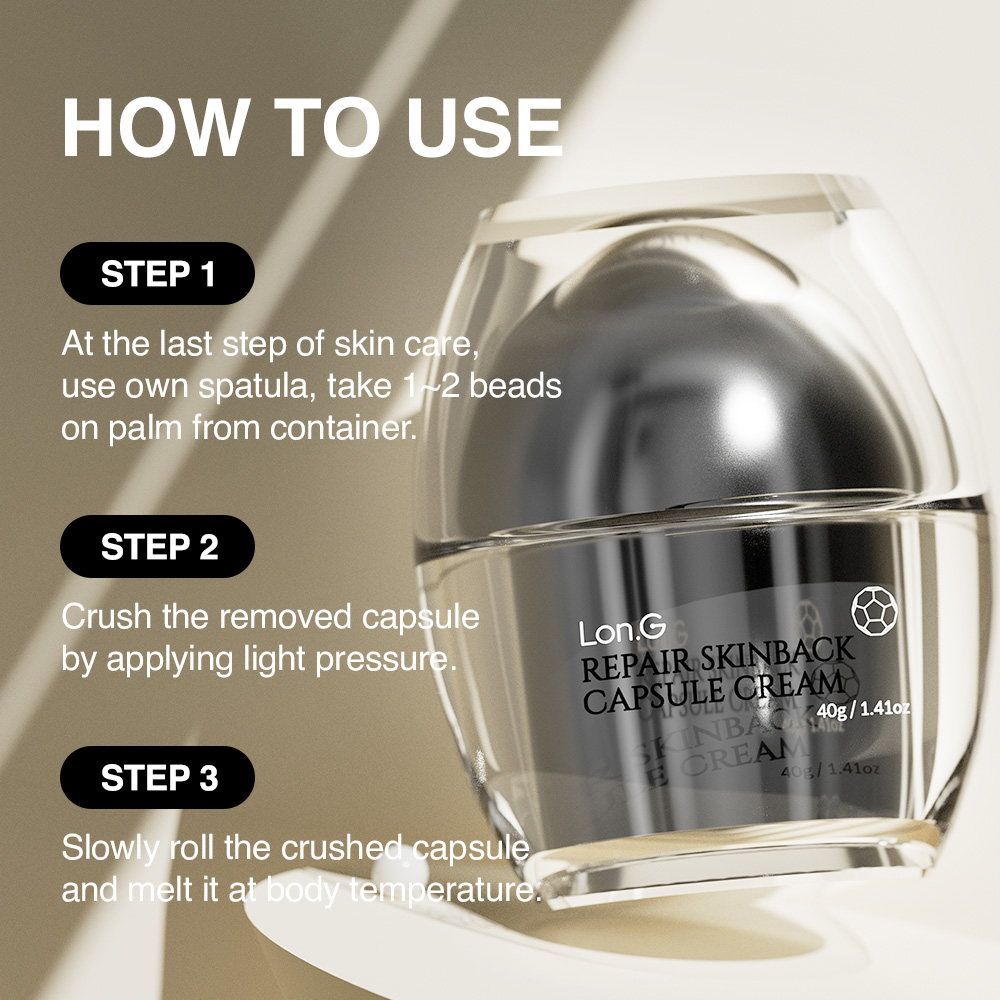 The repair cream features a pearl-like moisturizing capsule texture. Each capsule stabilizes and contains nourishing ingredients that roll smoothly and evenly upon application, providing a moisturizing feeling without stickiness and a fresh finish.