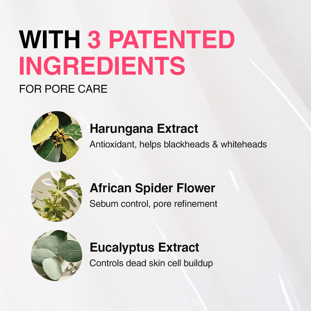 Harungana extract, African spider flower, and Eucalyptus Extract work together to manage excess sebum and impurities deep inside pores, leaving them visibly refined.